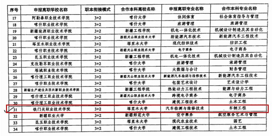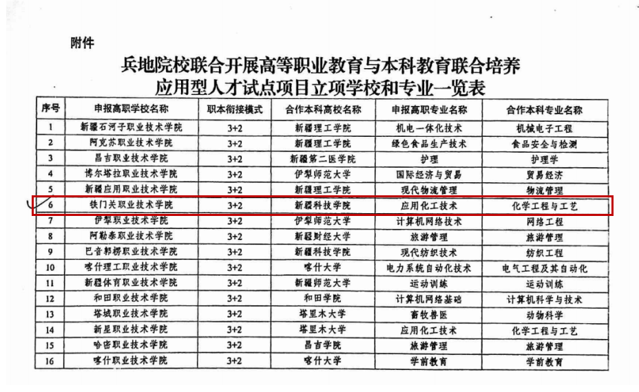 5月15日,新疆维吾尔自治区教育厅正式公布高等职业教育与本科教育联合培养试点项目名单。sunbet申搏官方网站应用化工技术、汽车检测与维修技术两个高职专业,分别与新疆科技学院化学工程与工艺专业、塔里木大学车辆工程专业联合申报的高等职业教育与本科教育联合培养“3+2”应用型人才试点项目成功入选。