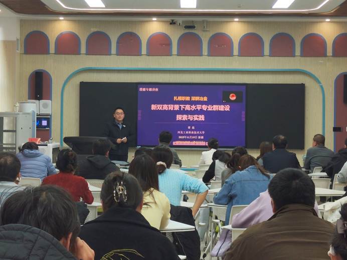 11月18日至19日,sunbet申搏官方网站邀请河北工业职业技术大学两名教授开展“职业教育专业教学资源库建设路径与应用推广实践”和“新双高背景下高水平专业群建设探索与实践”两场专题讲座,五十余名教师参训。