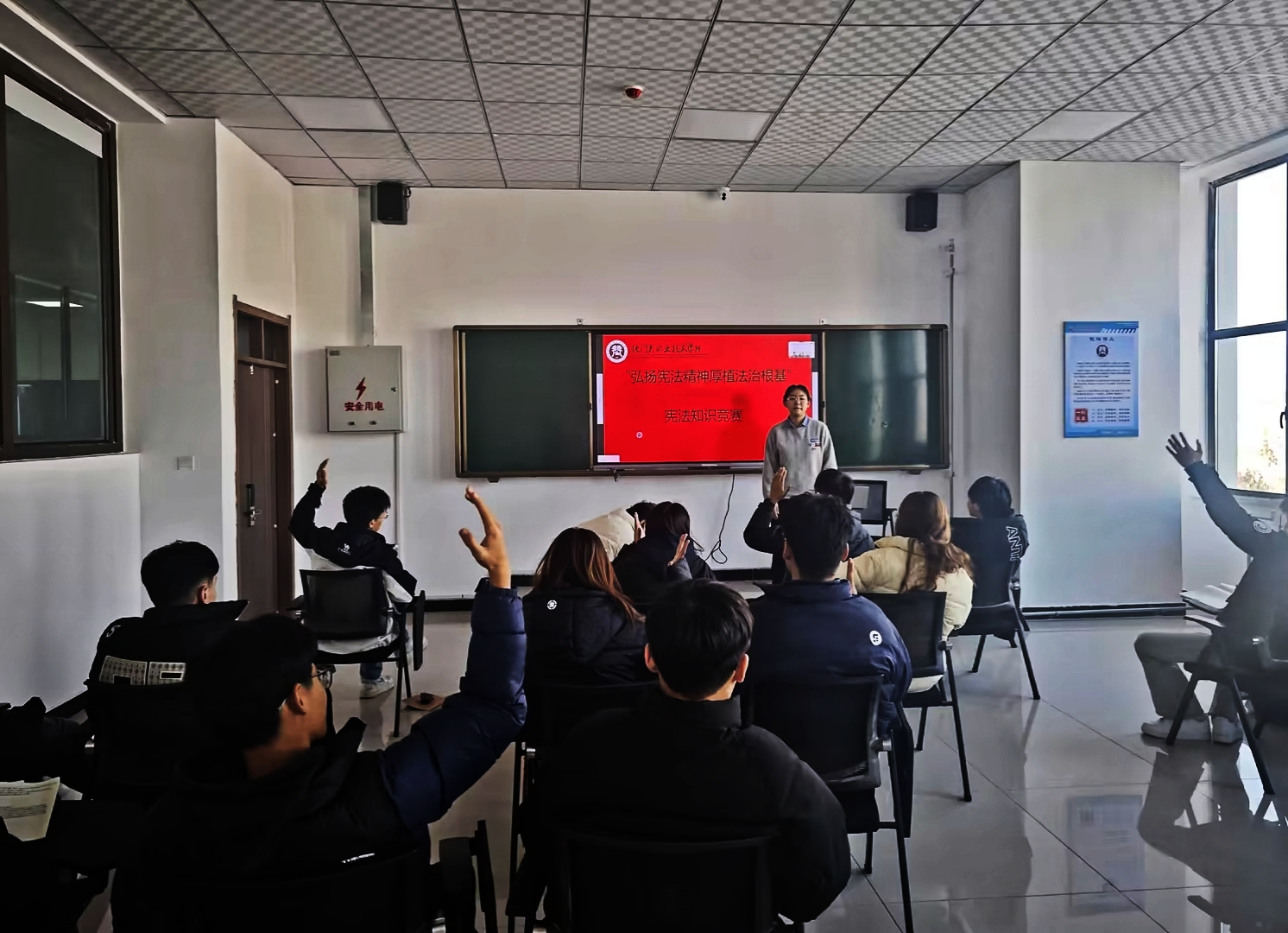 宪法知识竞赛内容涉及公民的基本权利和义务、人民法院与人民检察院的职责和权利、全国人民代表大会的职权等方面,考验大家对宪法知识的掌握程度,通过这种互动性强的问答方式,使得枯燥的法律条文变得生动易懂,有效提升学生们的法治素养,营造浓厚的法治学习氛围。