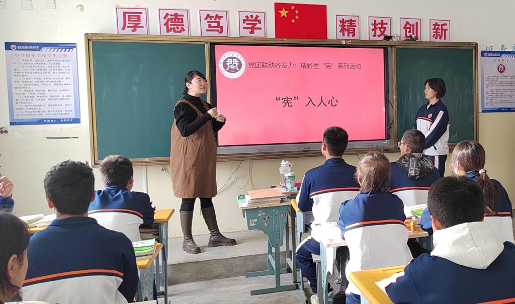 宪法晨读活动由党支部组织委员和团员代表领读,全体团员和学生代表齐声跟读,同学们精神饱满,庄严肃穆,声声入耳,每一位同学都用心体会宪法的神圣与庄严,引导学生遵守法律,维护宪法权威,增强宪法意识。活动当天,支部还开展了党员宣讲宪法进班级、“宪”入人心知识抢答竞赛、精彩呈“宪”讲解宪法等系列活动,此次活动参与人数570余人。