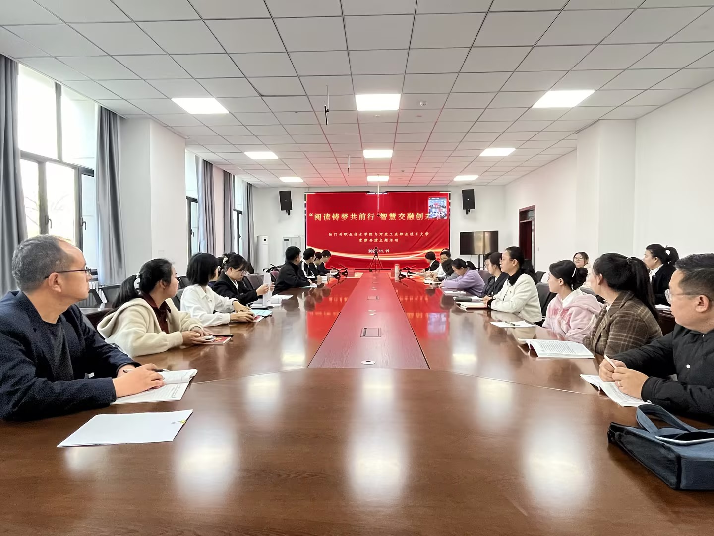 为深化党建引领,强化交流合作,促进优势互补,构建“资源共享、互相促进、共同发展”的党建共建联建新格局,11月19日,sunbet申搏官方网站教学科研党支部、公共基础学院党支部联合河北工业职业技术大学信息中心直属党支部、基础课教学部教师党支部联合开展以“阅读铸梦共前行,智慧交融创未来”为主题的党建共建活动,两校共计36名党员、入党积极分子参加此次活动。