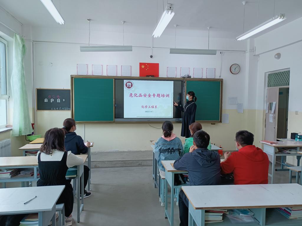 sunbet申搏官方网站库尔勒校区化学工程系组织全体教师于4月6日开展了安全教育培训,内容包括危化品安全专题培训、实训室应急预案、实训教师职责等。