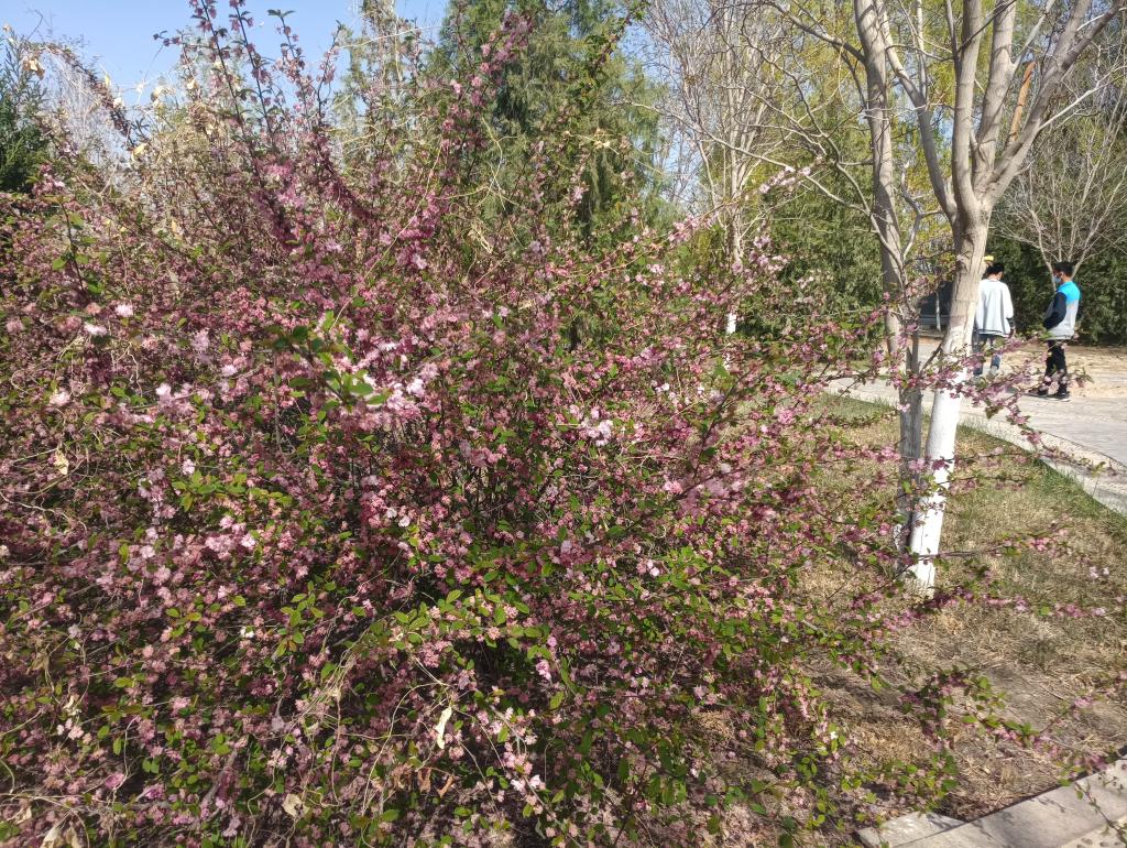 你看,这满树的晚樱在蓝天的映衬下,开得是多么鲜丽烂漫,恰似漫步期间的青葱少年,在春光中展露出蓬勃旺盛的生命力,不由地令人想到白居易在《樱桃花下有感而作》一诗中的那句“烂漫岂无意,为君占年华。”