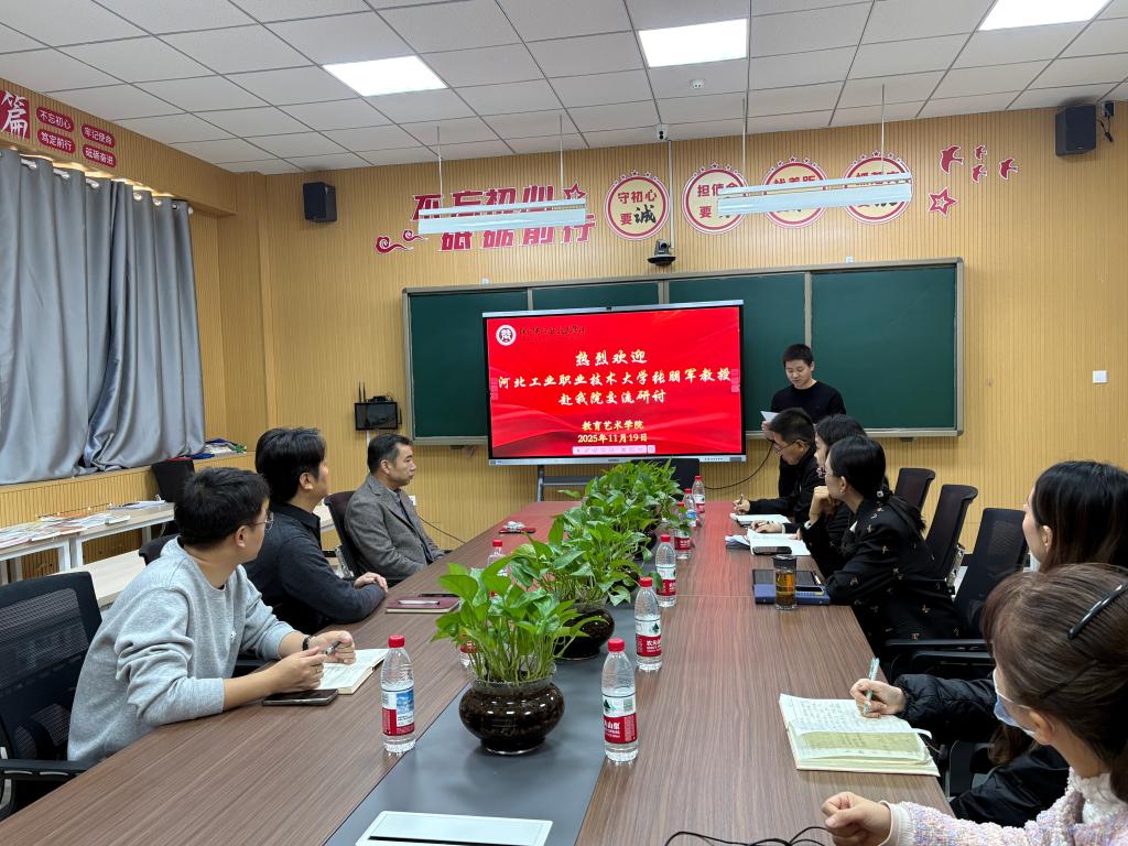 为精准对接行业需求、推动学前教育等专业高质量转型,11月19日,sunbet申搏官方网站教育艺术学院在德艺楼305党员活动室举办专业转型交流研讨会,特邀河北工业职业技术大学张朋军教授莅临指导。学院负责人及各教研室负责人、美术教研组全体教师参加研讨。
