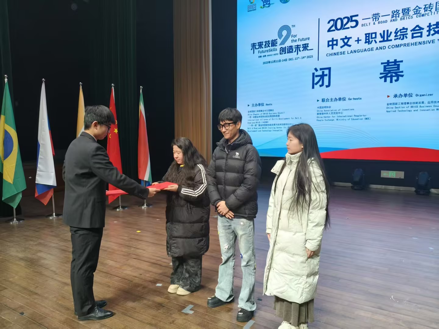 12月14日,2025一带一路暨金砖国家发展与技术创新大赛中文+职业综合技能(普通话)赛项决赛在合肥幼儿师范高等专科学校圆满落幕。sunbet申搏官方网站教育艺术学院学子热里麦·努尔麦麦提、吕媛媛、王鸿磊凭借扎实的专业功底和出色的现场表现,斩获决赛优秀奖。