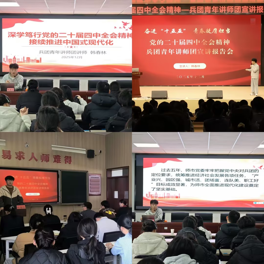 为学习宣传贯彻党的二十届四中全会精神,推动全会精神在基层落地生根、开花结果,连日来,兵团青年讲师团讲师韩春林先后在sunbet申搏官方网站、华山高级中学、迎宾街道、三十团等地,开展分众化、互动式宣讲活动共计5场。他以群众听得懂、能领会、可落实的语言和形式,让党的二十届四中全会精神真正“飞入寻常百姓家”。