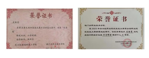 史银亮在校期间,展现出了异于常人的才华和刻苦精神。他常常是第一个到达教室,最后一个离开的学生。他深入研究汽修知识,积极参与实践操作,努力提升自己的技能水平,积极参加技能大赛。在2021年,他参加了南屯杯车身维修技能大赛,成功获得了南屯杯优秀奖;在2023年5月,参加了全国职业院校技能大赛新疆选拨赛,并荣获二等奖。他以其出类拔萃的技能和坚持不懈的努力,赢得了旁人的赞誉和比赛的荣誉。