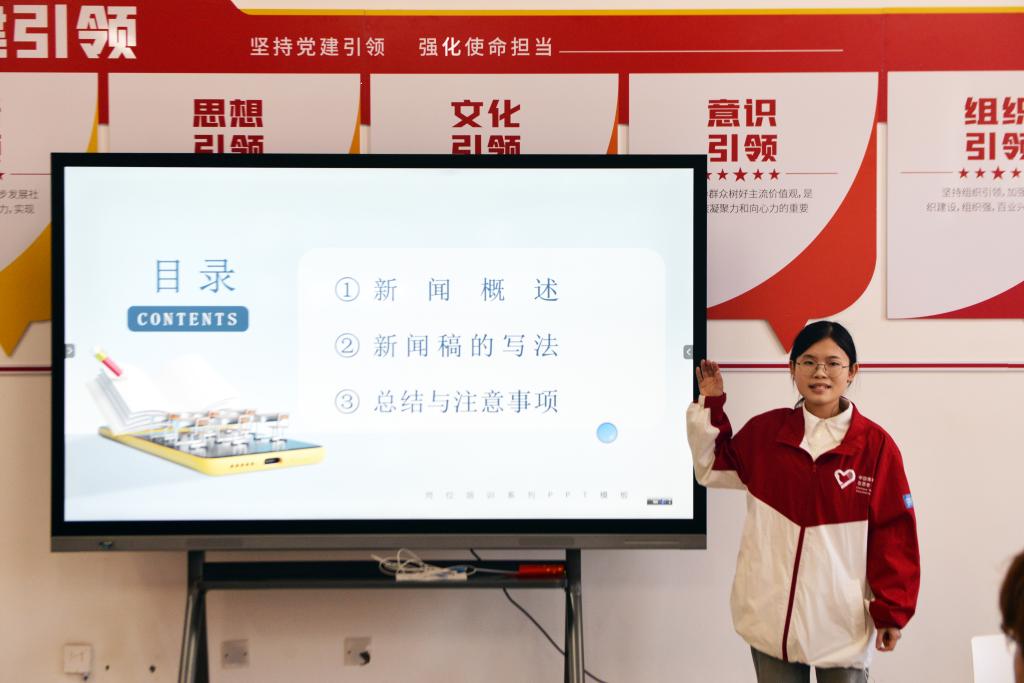党政办公室西部计划志愿者教师华美琳结合自身的工作实际,从学习新闻写作的基本特点、新闻发稿方法和技巧进行了讲解。详细阐述了新闻的五要素、新闻的结构、新闻的信息类型等。并结合实际的新闻案例,从标题新颖、把握主题、叙述方式、细节生动、修辞运用和把握开头、结尾等方面,分享专题新闻摄影报道配文的写作技巧。深入阐述如何从多个观察视角,将新闻稿件写得更有新意、更加鲜活。