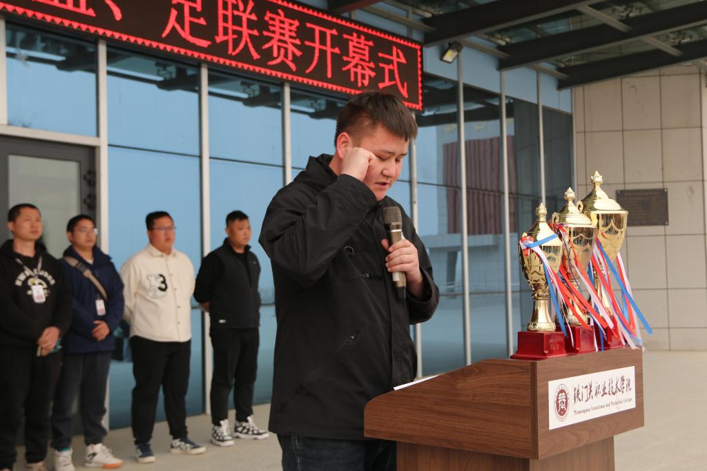 本次篮足联赛开幕式在“迎奖杯”中拉开帷幕,学院学生工作负责人致开幕词,希望运动员们能够秉承“友谊第一,比赛第二”的精神,以饱满的热情投入比赛之中,顽强拼搏,赛出风格,赛出水平;以本次比赛为契机,增强班级凝聚力,发挥团结协作精神,营造团结向上的良好班风,展现铁职学子球艺风采