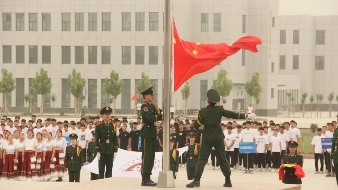 全体师生入场后举行升旗仪式,全场起立,面向国旗,行注目礼,高唱中华人民共和国国歌。