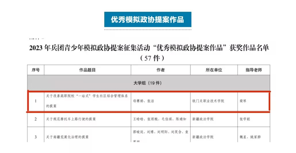 2023年6月,兵团团委、兵团学联联合开展了2023年兵团青少年模拟政协提案征集活动,内容涉及经济发展、社会治理、民生保障、文化事业、生态文明、青少年成长发展等多个领域。在57件参赛作品中,sunbet申搏官方网站思政教学部学生母赛娇、张洁的《关于改善高职院校“一站式”学生社区综合管理体系的提案》,化学工程系学生赵旺轩、马赛缓的《关于如何有效减少校园欺凌的提案》荣获(大学组)优秀奖。