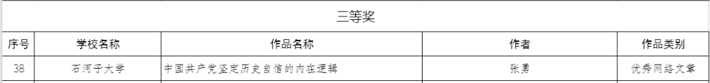 近日,兵团教育局公布了《2023年兵团大学生网络文化节和兵团高校网络教育优秀作品推选展示活动获奖名单》、《2023年兵团高校习近平新时代中国特色社会主义思想大学习领航计划主题教育活动获奖名单》,学院积极组织师生作品申报、高校推荐、资格审核、专家评选,在兵团大学生网络文化节中荣获“三等奖”三项;高校网络教育优秀作品中荣获“二等奖”四项、“三等奖”一项;大学生讲思政课公开课展示活动中荣获“二等奖”两项、“三等奖”一项。获奖名单(部分)如下: