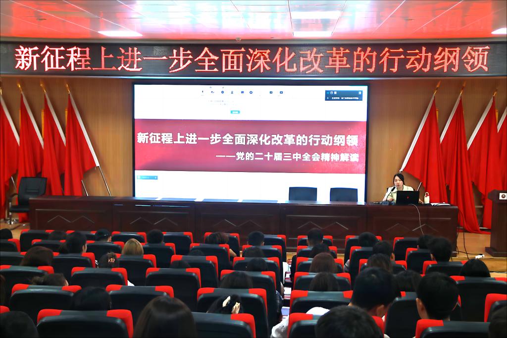 宣讲会在学院燕赵楼阶梯教室举行,主讲人为马克思主义学院思想道德与法治教研室负责人。本次宣讲以《新征程上进一步全面深化改革的行动纲领---党的二十届三中全会精神解读》为主题,从二十届三中全会的定位讲起,针对《中共中央关于进一步全面深化改革、推进中国式现代化的决定》从“为什么改、向哪里改、怎么改”三个方面对全会精神进行了全面系统的阐释和解读。