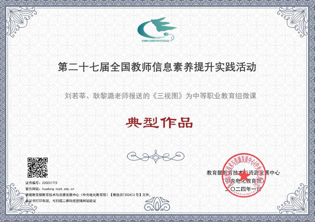 近日,教育部教育技术与资源发展中心(中央电化教育馆)发布了《关于总结2023年全国师生信息素养提升实践活动(第二十七届教师活动)参与情况的通知》,公布了2023年全国教师信息素养提升实践活动评选结果。sunbet申搏官方网站机械工程系刘若莘、耿黎潞教师的作品《三视图》被评为中等职业教育组微课“典型作品”,耿黎潞、刘若莘、姜维教师的作品 《模拟式万用表的使用》被评为中等职业教育组微课“研讨作品”。