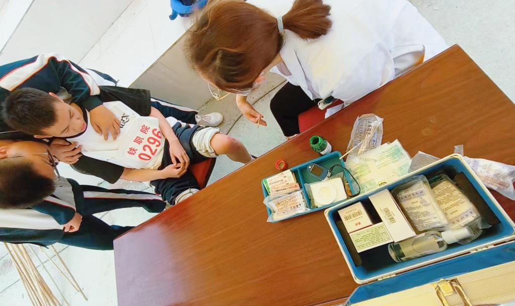 在运动会期间,也遇到了一些紧急情况。一名学生在跳远比赛中不慎摔倒,膝盖以及肘部着地,便立即上前进行初步评估,发现学生可活动行走,膝盖处有多面积擦伤,学校校医对该学生及时做出了伤口处理,并嘱咐学生伤口后期的注意事项。