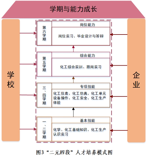 化学工程系应用化工技术专业构建了“二元(学校、企业)四段(基本技能、专项技能、综合能力、岗位能力)”的人才培养模式,如图5所示。