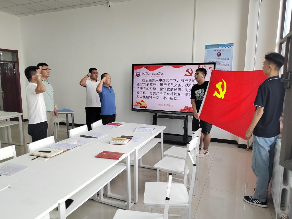 随后,在党支部书记的带领下,全体党员面向党旗,庄严宣誓,重温入党誓词。